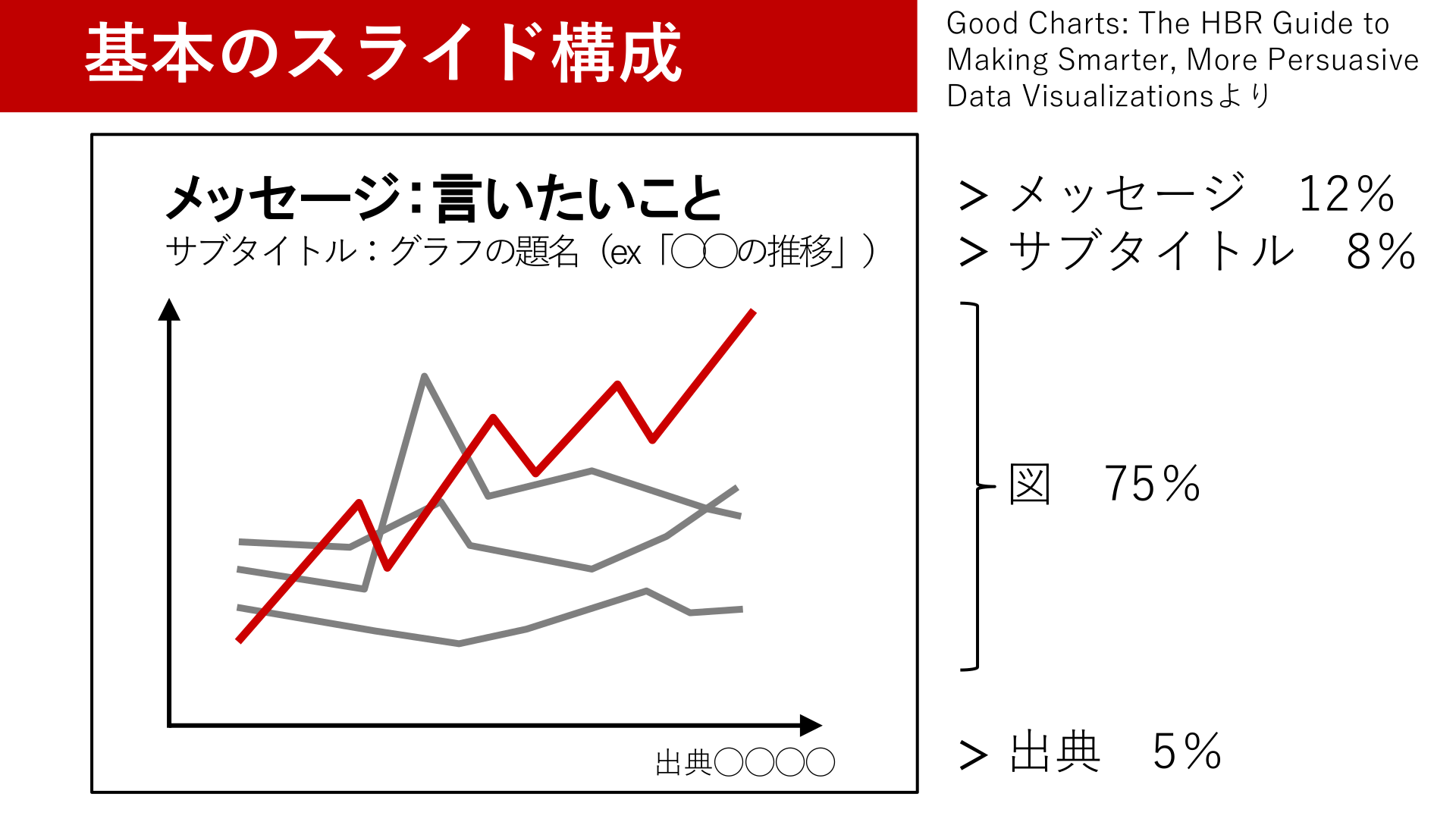 #8. 基本のスライド構成 メッセージ:言いたいこと サブタイトル:グラフの題名(ex「◯◯の推移」) Good Charts: The HBR Guide to Making Smarter, More Persuasive Data Visualizationsより メッセージ 12% > サブタイトル 8% > 図 75% 出典◯◯◯◯ > 出典 5%