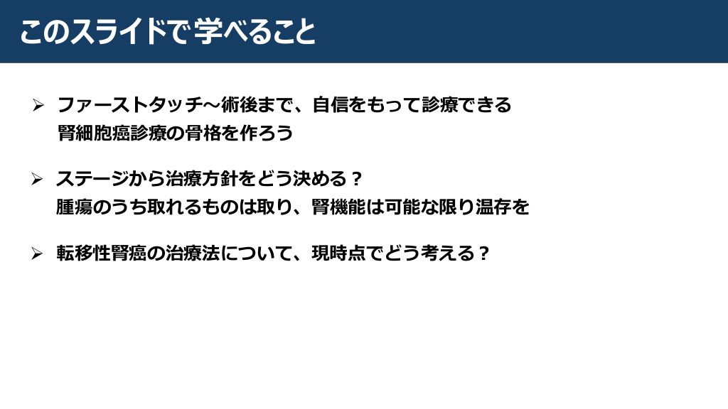 このスライドでは、腎細胞癌に関する包括的な復習を行い、医師がファーストタッチから術後ケアまで自信を持って対応できる診療の流れを解説しました。腎細胞癌のステージに基づく治療戦略、腫瘍の評価と必要な検査項目、診断基準を詳細に解説し、転移性腎癌の治療法についても最新の考え方を紹介しています。腎癌診療の現場で必要な情報をぜひ実践に活かしていただきたいです。