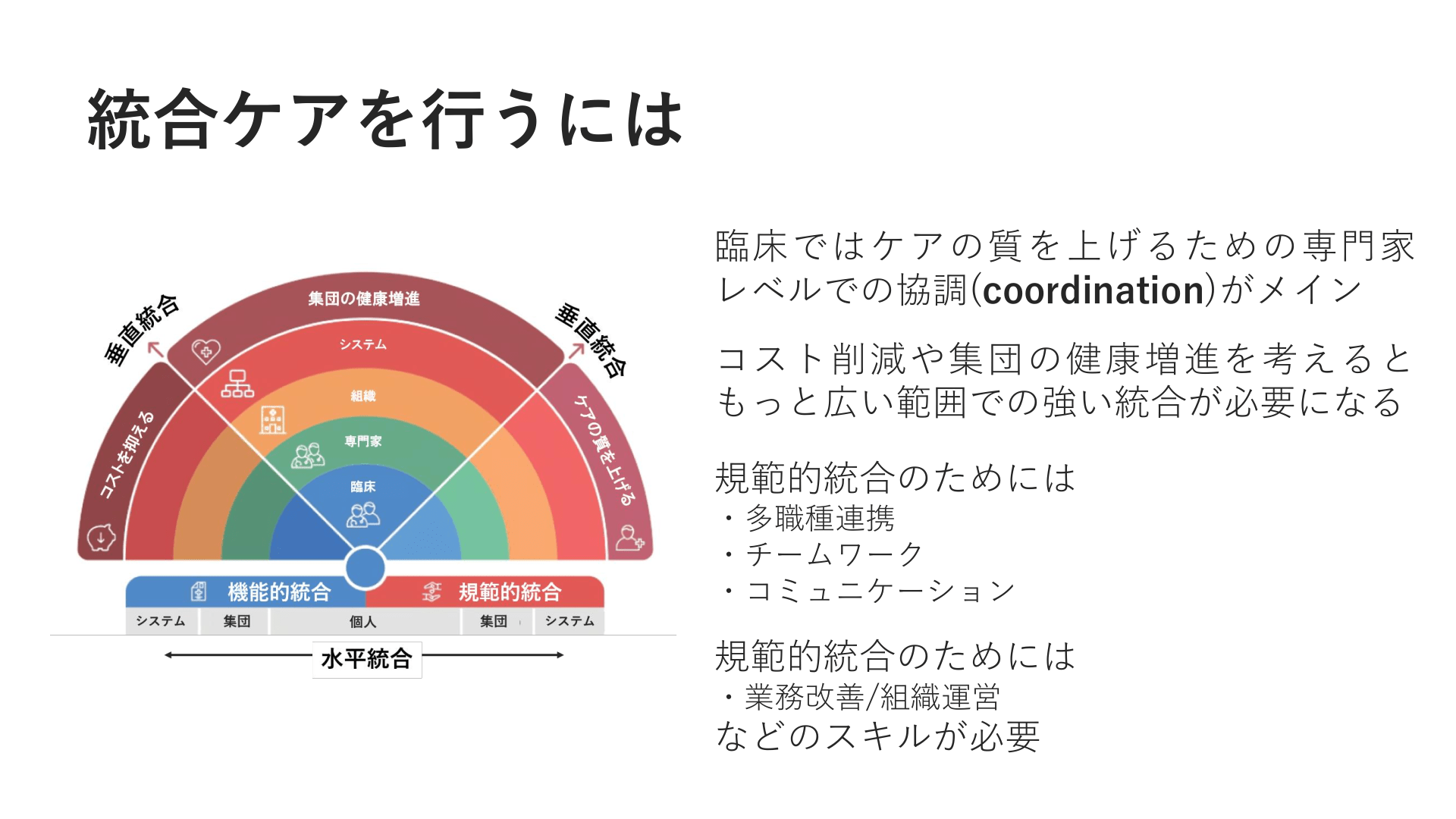 #10. 統合ケアを行うには 臨床ではケアの質を上げるための専門家 レベルでの協調(coordination)がメイン コスト削減や集団の健康増進を考えると もっと広い範囲での強い統合が必要になる 規範的統合のためには ・多職種連携 ・チームワーク ・コミュニケーション 規範的統合のためには ・業務改善/組織運営 などのスキルが必要