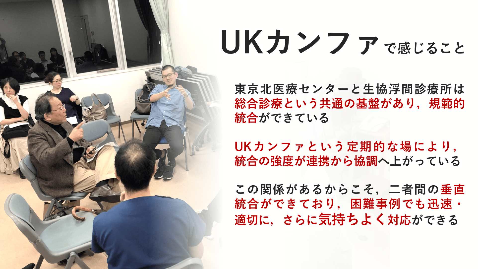 #11. UKカンファで感じること 東京北医療センターと生協浮間診療所は 総合診療という共通の基盤があり,規範的 統合ができている UK カ ン フ ァ と い う 定 期 的 な 場 に よ り , 統合の強度が連携から協調へ上がっている この関係があるからこそ,二者間の垂直 統合ができており,困難事例でも迅速・ 適切に,さらに気持ちよく対応ができる