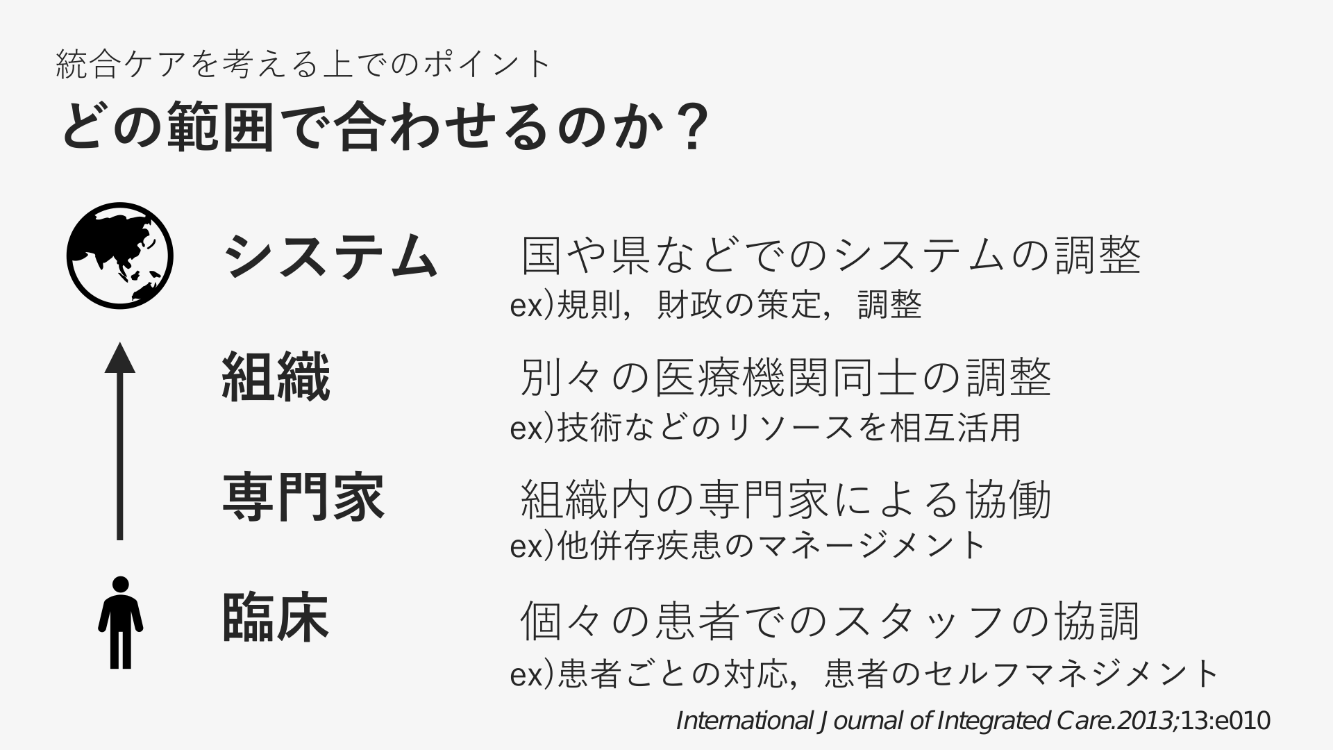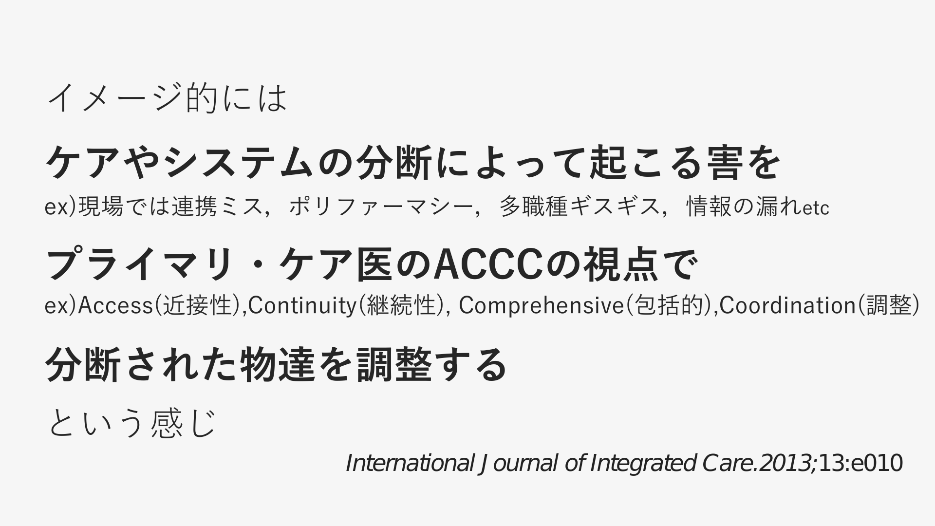 #3. イメージ的には ケアやシステムの分断によって起こる害を ex)現場では連携ミス,ポリファーマシー,多職種ギスギス,情報の漏れetc プライマリ・ケア医のACCCの視点で ex)Access(近接性),Continuity(継続性), Comprehensive(包括的),Coordination(調整) 分断された物達を調整する という感じ International Journal of Integrated Care.2013;13:e010