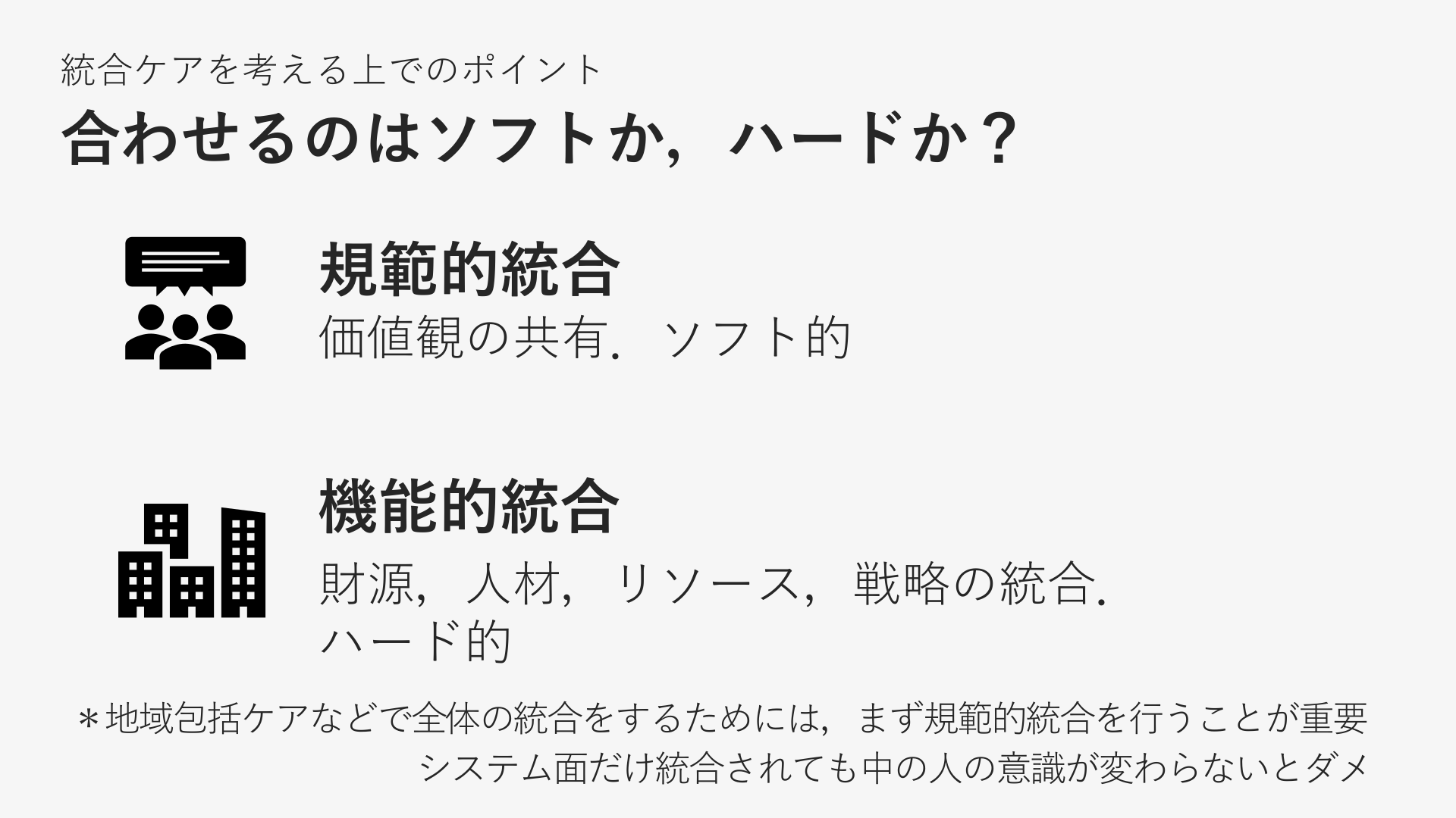#6. 統合ケアを考える上でのポイント 合わせるのはソフトか,ハードか? 規範的統合 価値観の共有.ソフト的 機能的統合 財源,人材,リソース,戦略の統合. ハード的 *地域包括ケアなどで全体の統合をするためには,まず規範的統合を行うことが重要 システム面だけ統合されても中の人の意識が変わらないとダメ