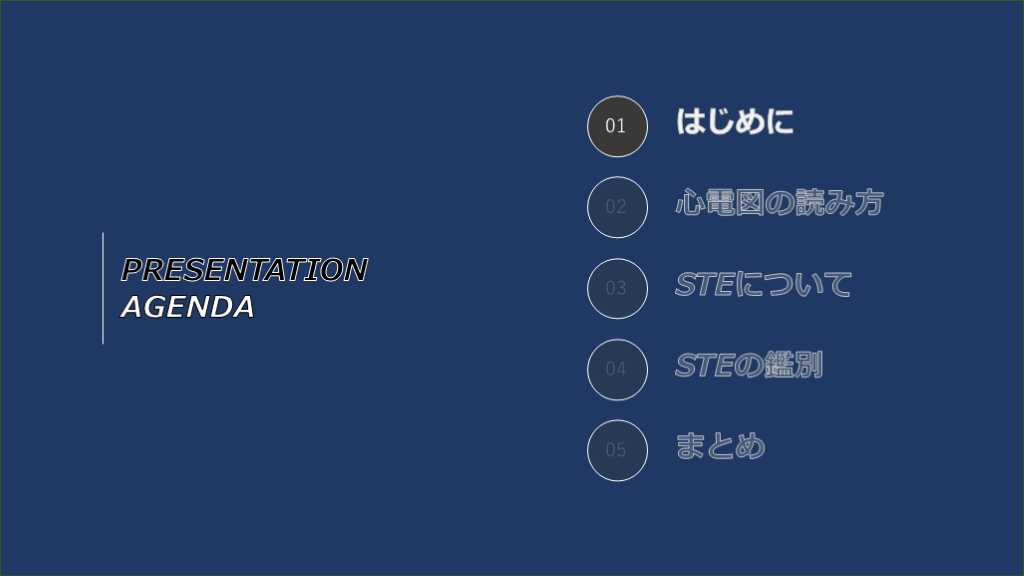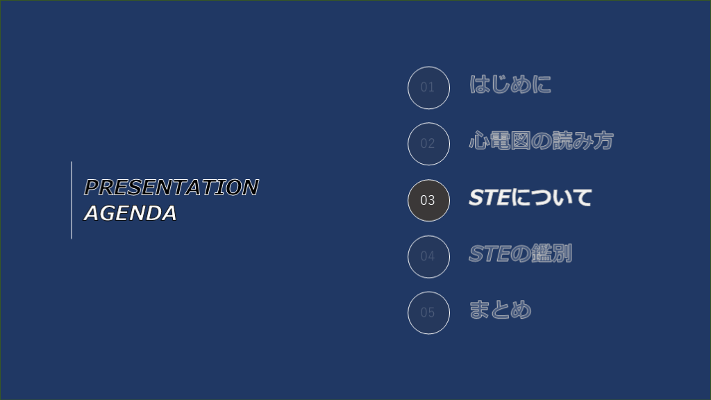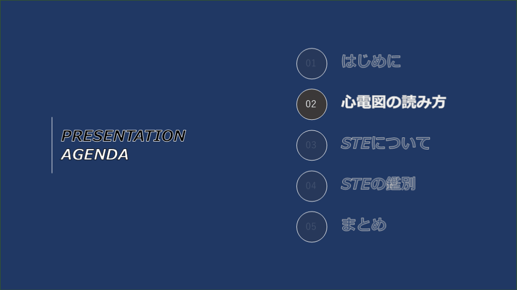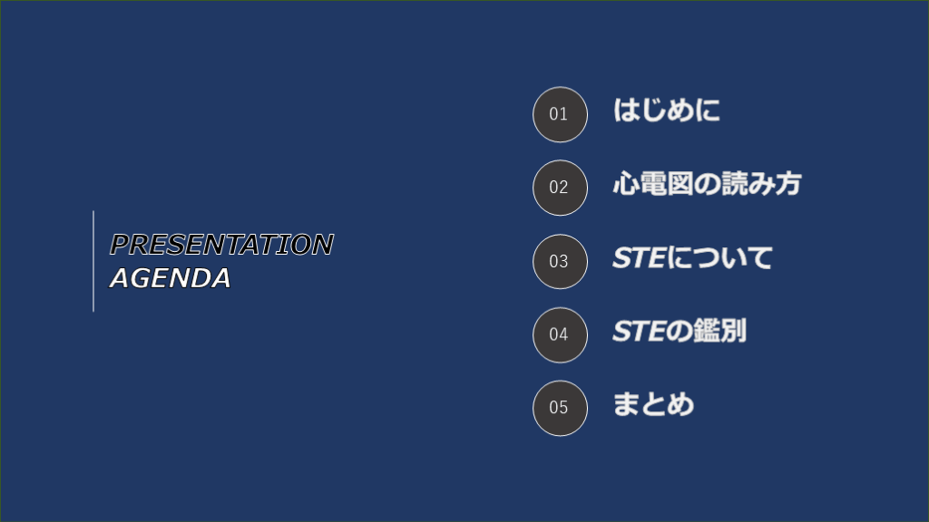 #3. PRESENTATIONAGENDA 01 02 03 04 05 はじめに 心電図の読み方 STEについて STEの鑑別 まとめ