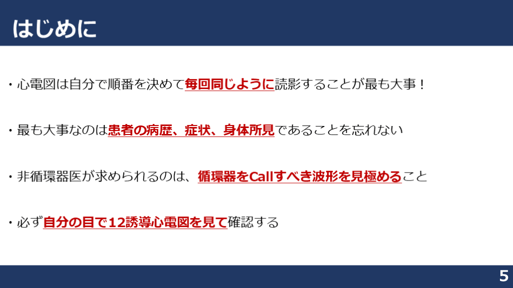 #5. はじめに 5 ・心電図は自分で順番を決めて毎回同じように読影することが最も大事!