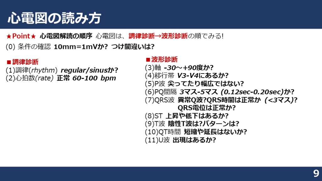 #9. 心電図の読み方 9 ★Point★ 心電図解読の順序 心電図は、調律診断→波形診断の順でみる!