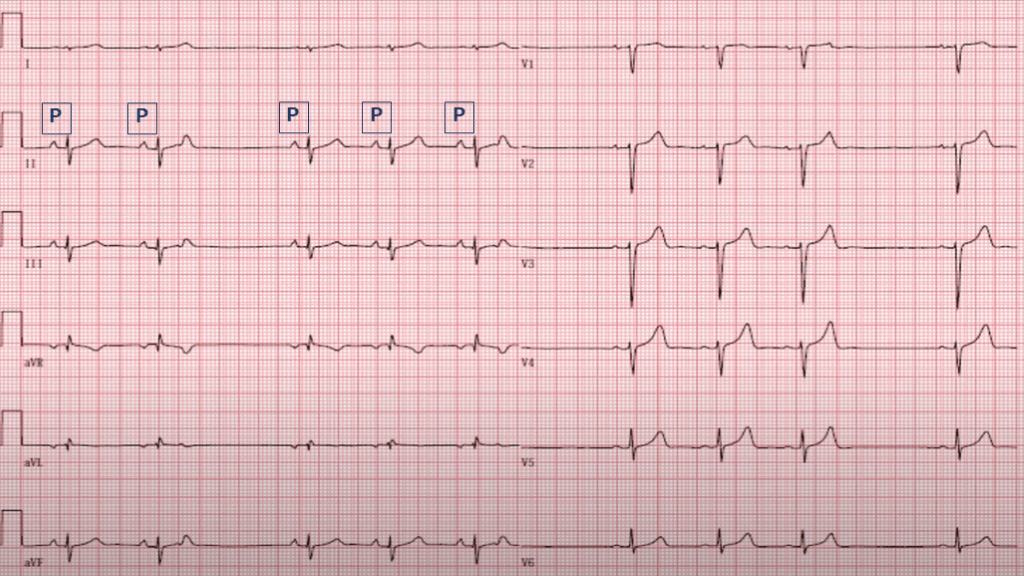 「P波があるか?」、P波がある場合「P波がQRSに対応しているか?」を確認する