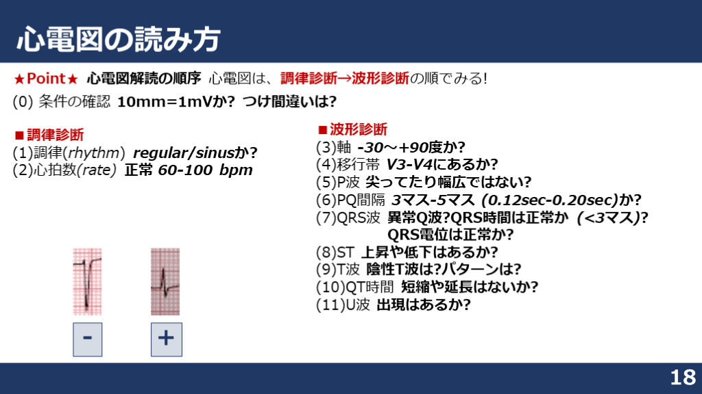#18. 心電図の読み方 18 ★Point★ 心電図解読の順序 心電図は、調律診断→波形診断の順でみる!