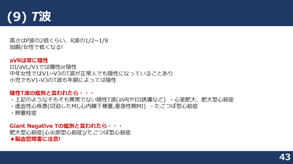 #43. (9) T波 43 高さはP波の2倍くらい、R波の1/2~1/8加齢/女性で低くなる!