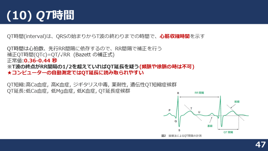 #47. (10) QT時間 47 QT時間(interval)は、QRSの始まりからT波の終わりまでの時間で、心筋収縮時間を示す