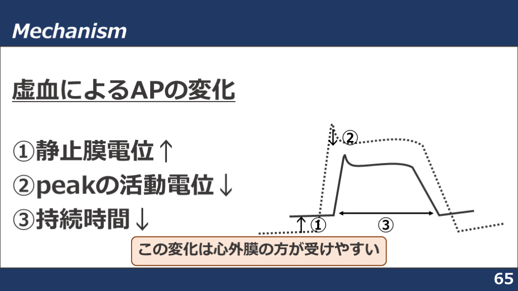 ③持続時間↓ Mechanism 65 ↑① ↓② ③ この変化は心外膜の方が受けやすい