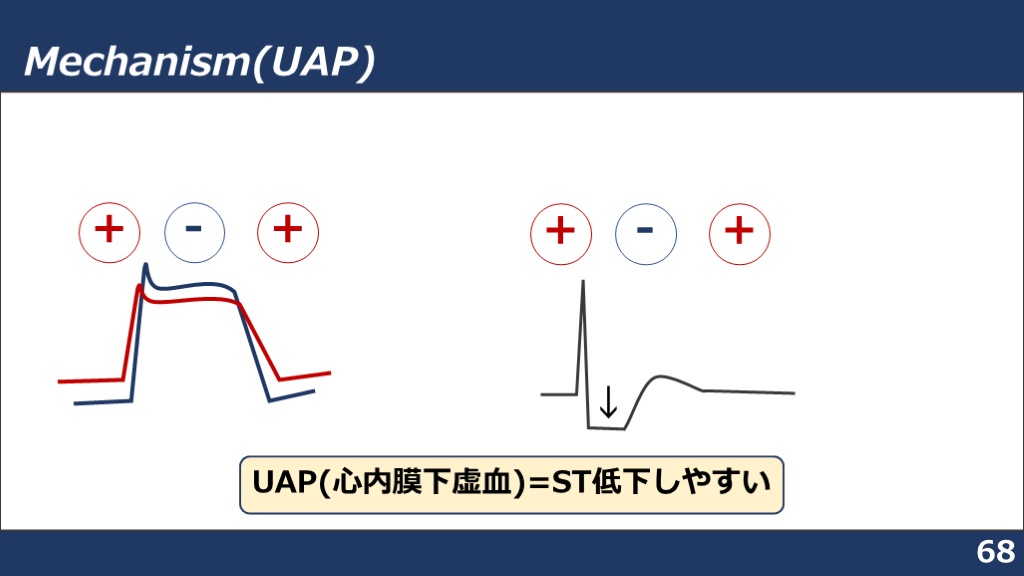 #66. Mechanism(UAP) 68 - + + - + + ↓ UAP(心内膜下虚血)=ST低下しやすい