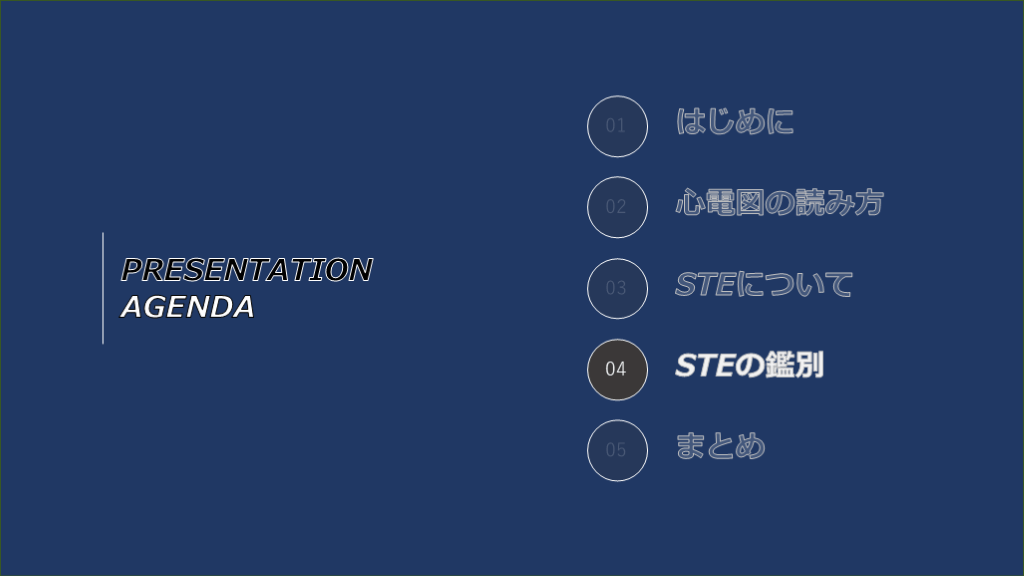 #4. PRESENTATIONAGENDA 01 02 03 04 05 はじめに 心電図の読み方 STEについて STEの鑑別 まとめ