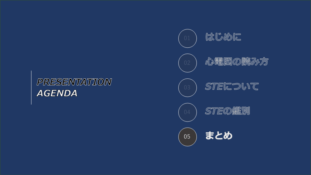 #6. PRESENTATIONAGENDA 01 02 03 04 05 はじめに 心電図の読み方 STEについて STEの鑑別 まとめ
