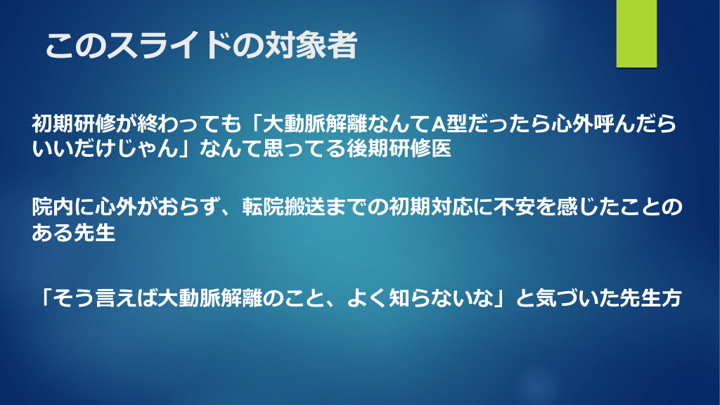 急性大動脈解離は診療現場で迅速な判断と対応が求められる疾患の一つです。初期研修を終えた医師や、手探り状態での初期対応に不安を抱えている医師のために、本記事では急性大動脈解離の病態理解から診断、初期対応に至るまでの重要なポイントを解説したスライドです。