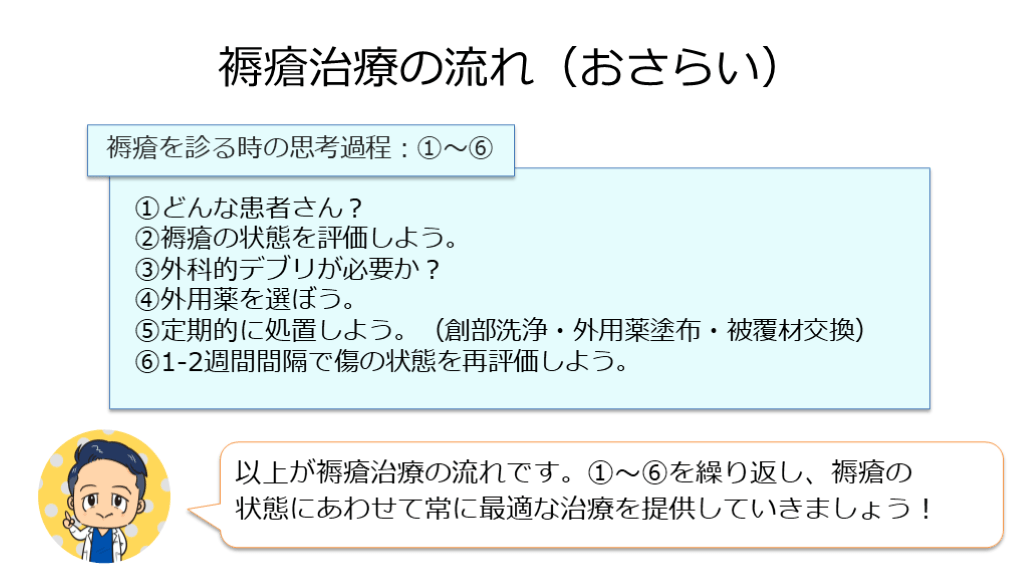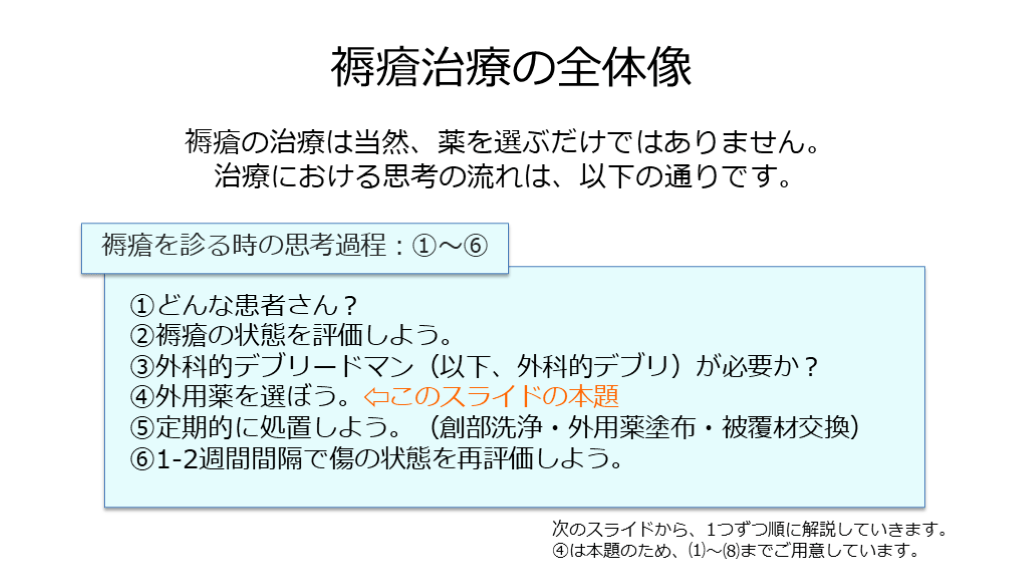 #3. 褥瘡治療の全体像 褥瘡を診る時の思考過程:①〜⑥ 褥瘡の治療は当然、薬を選ぶだけではありません。