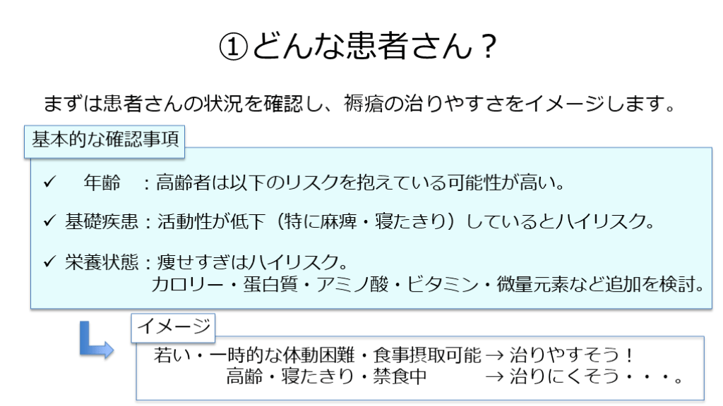 #4. ①どんな患者さん? まずは患者さんの状況を確認し、褥瘡の治りやすさをイメージします。