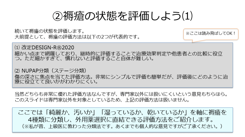 このスライドは専門家以外を対象としているため、上記の評価方法は扱いません。 続いて褥瘡の状態を評価します。