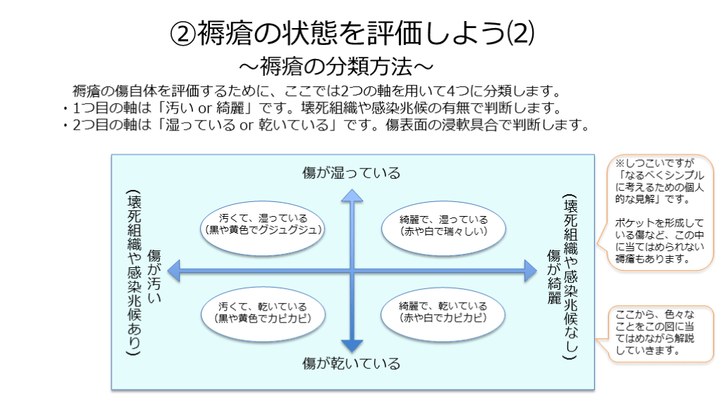 大前提として、褥瘡の評価方法は以下の2つが代表的です。 ※ここは読み飛ばしてOK! ここでは「綺麗か、汚いか」「湿っているか、乾いているか」を軸に褥瘡を