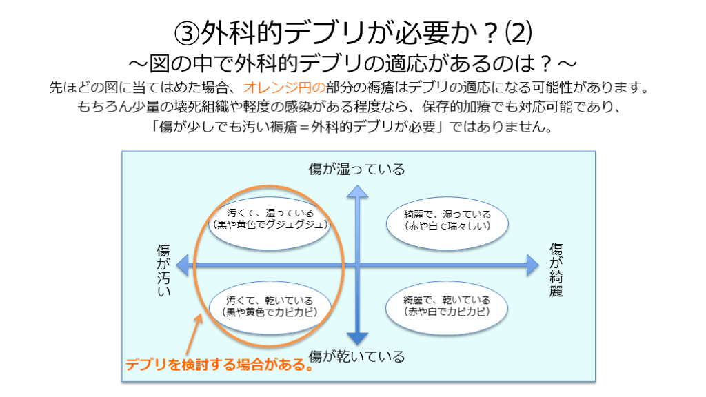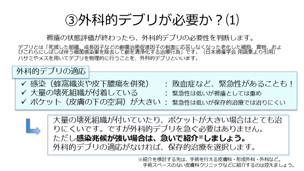 「傷が少しでも汚い褥瘡=外科的デブリが必要」ではありません。 デブリを検討する場合がある。