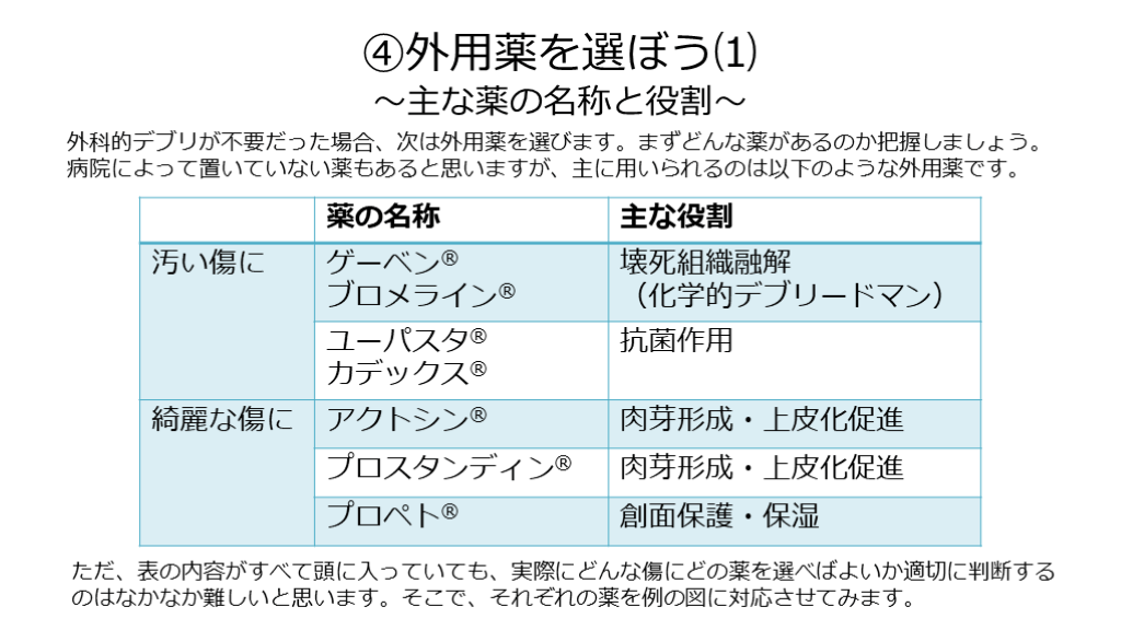 #9. ④外用薬を選ぼう⑴〜主な薬の名称と役割〜 外科的デブリが不要だった場合、次は外用薬を選びます。まずどんな薬があるのか把握しましょう。病院によって置いていない薬もあると思いますが、主に用いられるのは以下のような外用薬です。