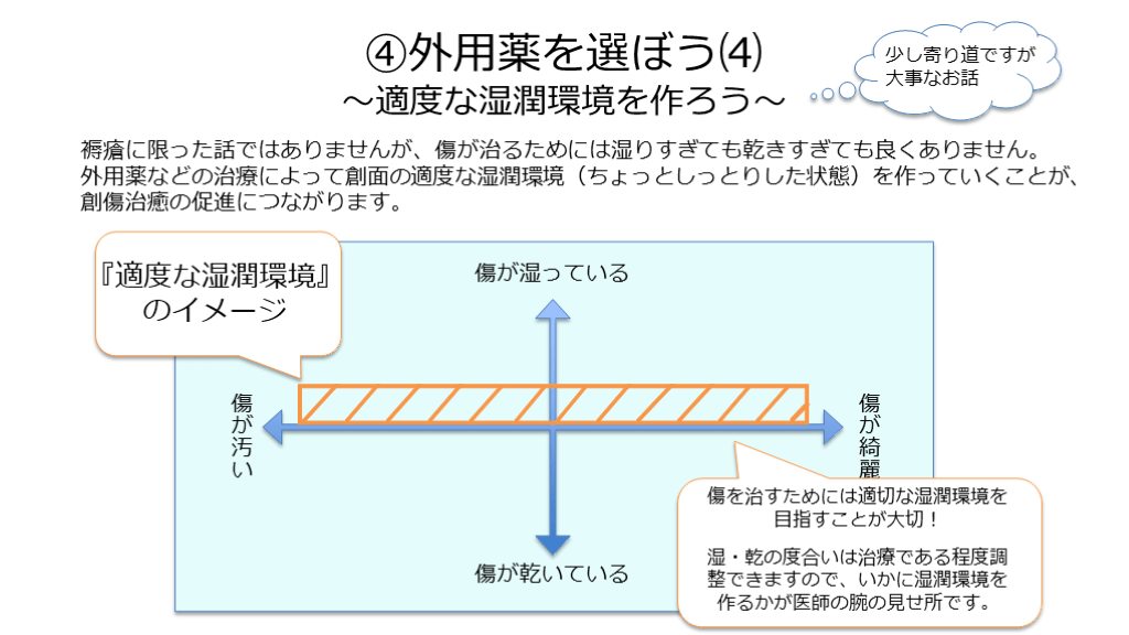 のイメージ ④外用薬を選ぼう⑷ 〜適度な湿潤環境を作ろう〜 褥瘡に限った話ではありませんが、傷が治るためには湿りすぎても乾きすぎても良くありません。