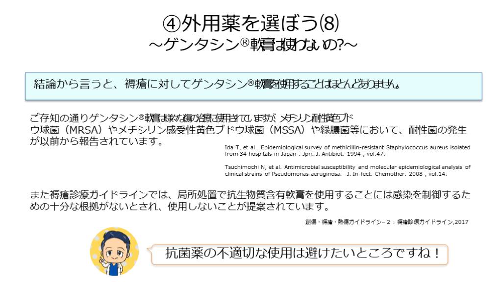 Tsuchimochi N, et al. Antimicrobial susceptibility and molecular epidemiological analysis of clinical strains of Pseudomonas aeruginosa. J. In-fect. Chemother. 2008 , vol.14. 創傷・褥瘡・熱傷ガイドライン−2:褥瘡診療ガイドライン,2017 抗菌薬の不適切な使用は避けたいところですね!