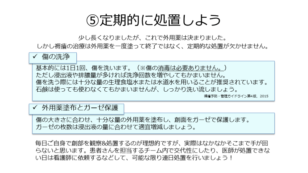 ⑤定期的に処置しよう。(創部洗浄・外用薬塗布・被覆材交換)