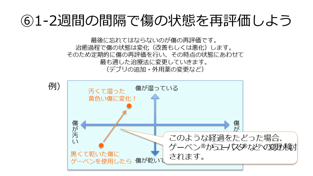 ⑥1-2週間間隔で傷の状態を再評価しよう。 次のスライドから、1つずつ順に解説していきます。