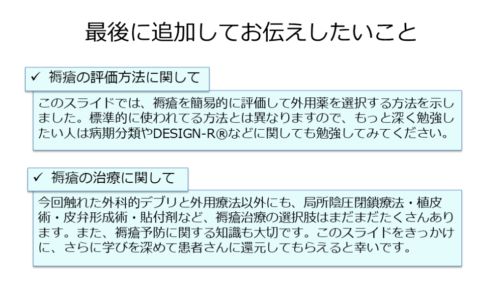 このスライドでは、褥瘡を簡易的に評価して外用薬を選択する方法を示しました。標準的に使われてる方法とは異なりますので、もっと深く勉強したい人は病期分類やDESIGN-R®などに関しても勉強してみてください。 最後に追加してお伝えしたいこと 今回触れた外科的デブリと外用療法以外にも、局所陰圧閉鎖療法・植皮術・皮弁形成術・貼付剤など、褥瘡治療の選択肢はまだまだたくさんあります。また、褥瘡予防に関する知識も大切です。このスライドをきっかけに、さらに学びを深めて患者さんに還元してもらえると幸いです。 褥瘡の治療に関して