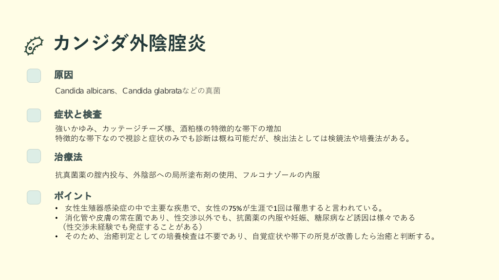 #10. カンジダ外陰腟炎 原因 Candida albicans、Candida glabrataなどの真菌 症状と検査 強いかゆみ、カッテージチーズ様、酒粕様の特徴的な帯下の増加 特徴的な帯下なので視診と症状のみでも診断は概ね可能だが、検出法としては検鏡法や培養法がある。 治療法 抗真菌薬の腟内投与、外陰部への局所塗布剤の使用、フルコナゾールの内服 ポイント • 女性生殖器感染症の中で主要な疾患で、女性の75%が生涯で1回は罹患すると言われている。 • 消化管や皮膚の常在菌であり、性交渉以外でも、抗菌薬の内服や妊娠、糖尿病など誘因は様々である (性交渉未経験でも発症することがある) • そのため、治癒判定としての培養検査は不要であり、自覚症状や帯下の所見が改善したら治癒と判断する。 preencoded.png