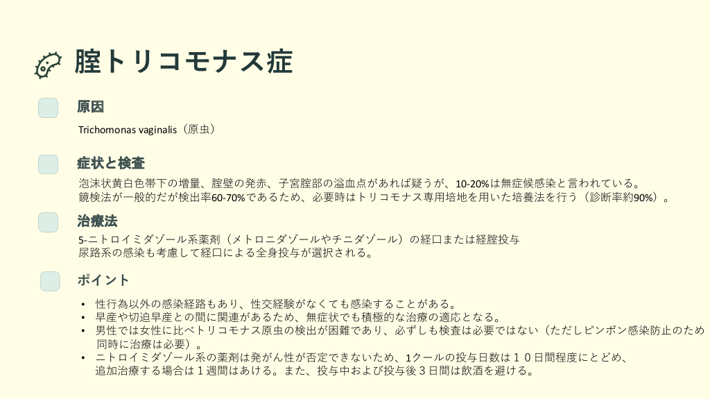 #11. 腟トリコモナス症 原因 Trichomonas vaginalis(原虫) 症状と検査 泡沫状黄白色帯下の増量、腟壁の発赤、子宮腟部の溢血点があれば疑うが、10-20%は無症候感染と言われている。 鏡検法が一般的だが検出率60-70%であるため、必要時はトリコモナス専用培地を用いた培養法を行う(診断率約90%)。 治療法 5-ニトロイミダゾール系薬剤(メトロニダゾールやチニダゾール)の経口または経腟投与 尿路系の感染も考慮して経口による全身投与が選択される。 ポイント • 性行為以外の感染経路もあり、性交経験がなくても感染することがある。 • 早産や切迫早産との間に関連があるため、無症状でも積極的な治療の適応となる。 • 男性では女性に比べトリコモナス原虫の検出が困難であり、必ずしも検査は必要ではない(ただしピンポン感染防止のため 同時に治療は必要)。 • ニトロイミダゾール系の薬剤は発がん性が否定できないため、1クールの投与日数は10日間程度にとどめ、 追加治療する場合は1週間はあける。また、投与中および投与後3日間は飲酒を避ける。 preencoded.png