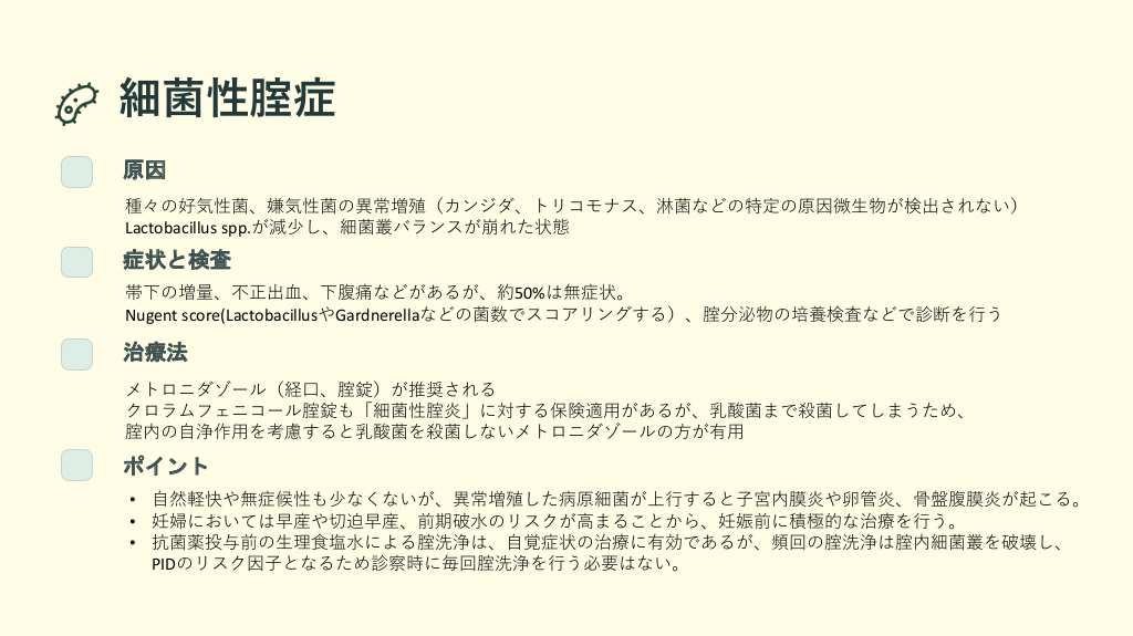 #12. 細菌性腟症 原因 種々の好気性菌、嫌気性菌の異常増殖(カンジダ、トリコモナス、淋菌などの特定の原因微生物が検出されない) Lactobacillus spp.が減少し、細菌叢バランスが崩れた状態 症状と検査 帯下の増量、不正出血、下腹痛などがあるが、約50%は無症状。 Nugent score(LactobacillusやGardnerellaなどの菌数でスコアリングする)、腟分泌物の培養検査などで診断を行う 治療法 メトロニダゾール(経口、腟錠)が推奨される クロラムフェニコール腟錠も「細菌性腟炎」に対する保険適用があるが、乳酸菌まで殺菌してしまうため、 腟内の自浄作用を考慮すると乳酸菌を殺菌しないメトロニダゾールの方が有用 ポイント • 自然軽快や無症候性も少なくないが、異常増殖した病原細菌が上行すると子宮内膜炎や卵管炎、骨盤腹膜炎が起こる。 • 妊婦においては早産や切迫早産、前期破水のリスクが高まることから、妊娠前に積極的な治療を行う。 • 抗菌薬投与前の生理食塩水による腟洗浄は、自覚症状の治療に有効であるが、頻回の腟洗浄は腟内細菌叢を破壊し、 PIDのリスク因子となるため診察時に毎回腟洗浄を行う必要はない。 preencoded.png