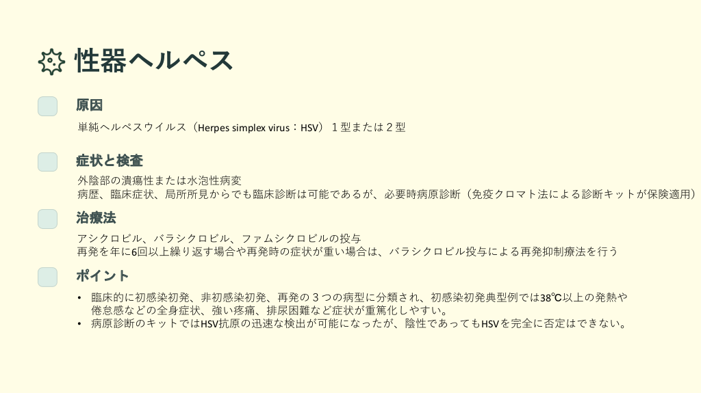 #14. 性器ヘルペス 原因 単純ヘルペスウイルス(Herpes simplex virus:HSV)1型または2型 症状と検査 外陰部の潰瘍性または水泡性病変 病歴、臨床症状、局所所見からでも臨床診断は可能であるが、必要時病原診断(免疫クロマト法による診断キットが保険適用) 治療法 アシクロビル、バラシクロビル、ファムシクロビルの投与 再発を年に6回以上繰り返す場合や再発時の症状が重い場合は、バラシクロビル投与による再発抑制療法を行う ポイント • 臨床的に初感染初発、非初感染初発、再発の3つの病型に分類され、初感染初発典型例では38℃以上の発熱や 倦怠感などの全身症状、強い疼痛、排尿困難など症状が重篤化しやすい。 • 病原診断のキットではHSV抗原の迅速な検出が可能になったが、陰性であってもHSVを完全に否定はできない。 preencoded.png