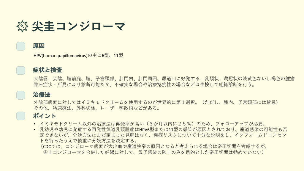 #15. 尖圭コンジローマ 原因 HPV(human papillomavirus)の主に6型、11型 症状と検査 大陰唇、会陰、腟前庭、腟、子宮頸部、肛門内、肛門周囲、尿道口に好発する、乳頭状、鶏冠状の淡黄色ないし褐色の腫瘤 臨床症状・所見により診断可能だが、不確実な場合や治療抵抗性の場合などは生検して組織診断を行う。 治療法 外陰部病変に対してはイミキモドクリームを使用するのが世界的に第1選択。(ただし、腟内、子宮頸部には禁忌) その他、冷凍療法、外科切除、レーザー蒸散術などがある。 ポイント • イミキモドクリーム以外の治療法は再発率が高い(3か月以内に25%)のため、フォローアップが必要。 • 乳幼児や幼児に発症する再発性気道乳頭腫症はHPV6型または11型の感染が原因とされており、産道感染の可能性も否 定できないが、分娩方法はまだ定まった見解はなく、発症リスクについて十分な説明をし、インフォームドコンセン トを行ったうえで慎重に分娩方法を決定する。 (CDCでは、コンジローマ病変が大出血や産道狭窄の原因となると考えられる場合は帝王切開を考慮するが、 尖圭コンジローマを合併した妊婦に対して、母子感染の防止のみを目的とした帝王切開は勧めていない) preencoded.png