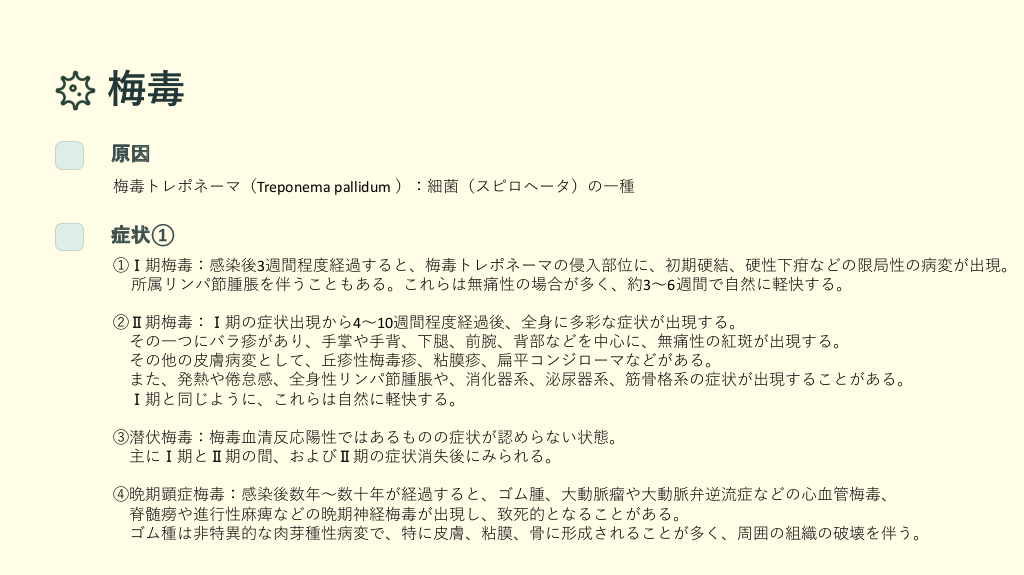 #16. 梅毒 原因 梅毒トレポネーマ(Treponema pallidum ):細菌(スピロヘータ)の一種 症状① ①Ⅰ期梅毒:感染後3週間程度経過すると、梅毒トレポネーマの侵入部位に、初期硬結、硬性下疳などの限局性の病変が出現。 所属リンパ節腫脹を伴うこともある。これらは無痛性の場合が多く、約3~6週間で自然に軽快する。 ②Ⅱ期梅毒:Ⅰ期の症状出現から4~10週間程度経過後、全身に多彩な症状が出現する。 その一つにバラ疹があり、手掌や手背、下腿、前腕、背部などを中心に、無痛性の紅斑が出現する。 その他の皮膚病変として、丘疹性梅毒疹、粘膜疹、扁平コンジローマなどがある。 また、発熱や倦怠感、全身性リンパ節腫脹や、消化器系、泌尿器系、筋骨格系の症状が出現することがある。 Ⅰ期と同じように、これらは自然に軽快する。 ③潜伏梅毒:梅毒血清反応陽性ではあるものの症状が認めらない状態。 主にⅠ期とⅡ期の間、およびⅡ期の症状消失後にみられる。 ④晩期顕症梅毒:感染後数年~数十年が経過すると、ゴム腫、大動脈瘤や大動脈弁逆流症などの心血管梅毒、 脊髄癆や進行性麻痺などの晩期神経梅毒が出現し、致死的となることがある。 ゴム種は非特異的な肉芽種性病変で、特に皮膚、粘膜、骨に形成されることが多く、周囲の組織の破壊を伴う。 preencoded.png