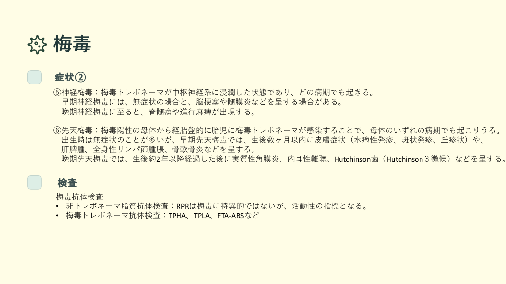 #17. 梅毒 症状② ⑤神経梅毒:梅毒トレポネーマが中枢神経系に浸潤した状態であり、どの病期でも起きる。 早期神経梅毒には、無症状の場合と、脳梗塞や髄膜炎などを呈する場合がある。 晩期神経梅毒に至ると、脊髄癆や進行麻痺が出現する。 ⑥先天梅毒:梅毒陽性の母体から経胎盤的に胎児に梅毒トレポネーマが感染することで、母体のいずれの病期でも起こりうる。 出生時は無症状のことが多いが、早期先天梅毒では、生後数ヶ月以内に皮膚症状(水疱性発疹、斑状発疹、丘疹状)や、 肝脾腫、全身性リンパ節腫脹、骨軟骨炎などを呈する。 晩期先天梅毒では、生後約2年以降経過した後に実質性角膜炎、内耳性難聴、Hutchinson歯(Hutchinson3徴候)などを呈する。 検査 梅毒抗体検査 • 非トレポネーマ脂質抗体検査:RPRは梅毒に特異的ではないが、活動性の指標となる。 • 梅毒トレポネーマ抗体検査:TPHA、TPLA、FTA-ABSなど preencoded.png