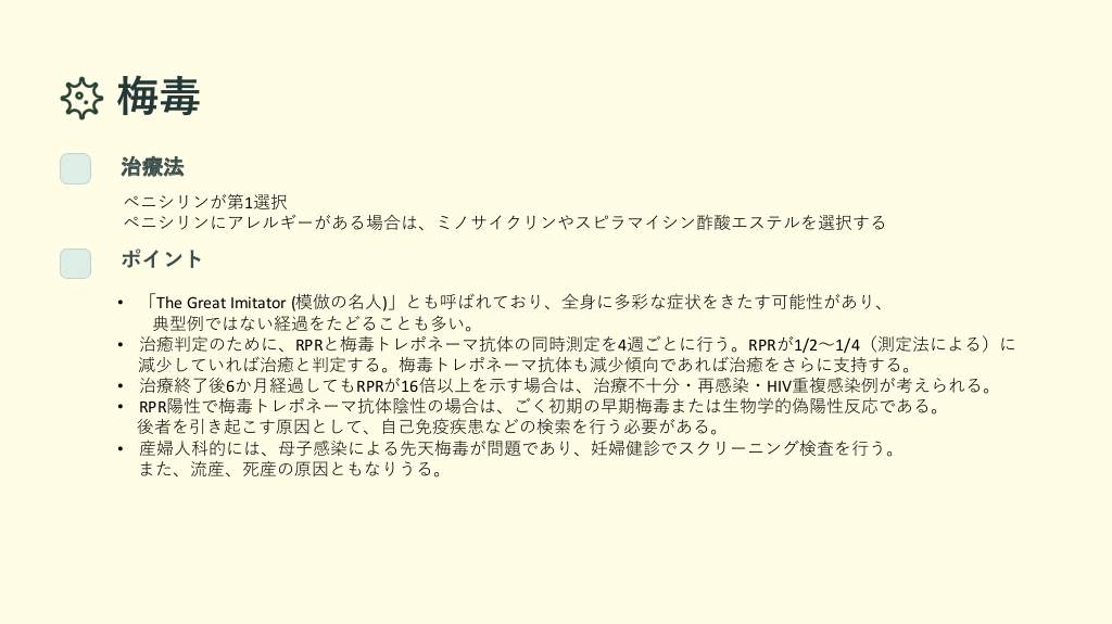 #18. 梅毒 治療法 ペニシリンが第1選択 ペニシリンにアレルギーがある場合は、ミノサイクリンやスピラマイシン酢酸エステルを選択する ポイント • 「The Great Imitator (模倣の名人)」とも呼ばれており、全身に多彩な症状をきたす可能性があり、 典型例ではない経過をたどることも多い。 • 治癒判定のために、RPRと梅毒トレポネーマ抗体の同時測定を4週ごとに行う。RPRが1/2~1/4(測定法による)に 減少していれば治癒と判定する。梅毒トレポネーマ抗体も減少傾向であれば治癒をさらに支持する。 • 治療終了後6か月経過してもRPRが16倍以上を示す場合は、治療不十分・再感染・HIV重複感染例が考えられる。 • RPR陽性で梅毒トレポネーマ抗体陰性の場合は、ごく初期の早期梅毒または生物学的偽陽性反応である。 後者を引き起こす原因として、自己免疫疾患などの検索を行う必要がある。 • 産婦人科的には、母子感染による先天梅毒が問題であり、妊婦健診でスクリーニング検査を行う。 また、流産、死産の原因ともなりうる。 preencoded.png