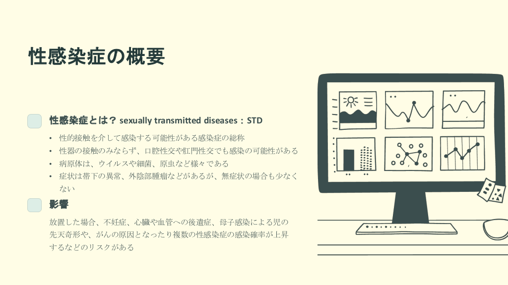 #2. 性感染症の概要 性感染症とは? sexually transmitted diseases:STD • 性的接触を介して感染する可能性がある感染症の総称 • 性器の接触のみならず、口腔性交や肛門性交でも感染の可能性がある • 病原体は、ウイルスや細菌、原虫など様々である • 症状は帯下の異常、外陰部腫瘤などがあるが、無症状の場合も少なく ない 影響 放置した場合、不妊症、心臓や血管への後遺症、母子感染による児の 先天奇形や、がんの原因となったり複数の性感染症の感染確率が上昇 するなどのリスクがある preencoded.png