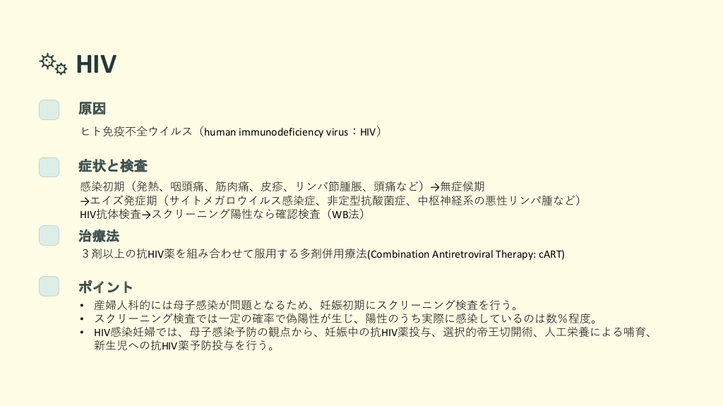 #20. HIV 原因 ヒト免疫不全ウイルス(human immunodeficiency virus:HIV) 症状と検査 感染初期(発熱、咽頭痛、筋肉痛、皮疹、リンパ節腫脹、頭痛など)→無症候期 →エイズ発症期(サイトメガロウイルス感染症、非定型抗酸菌症、中枢神経系の悪性リンパ腫など) HIV抗体検査→スクリーニング陽性なら確認検査(WB法) 治療法 3剤以上の抗HIV薬を組み合わせて服用する多剤併用療法(Combination Antiretroviral Therapy: cART) ポイント • 産婦人科的には母子感染が問題となるため、妊娠初期にスクリーニング検査を行う。 • スクリーニング検査では一定の確率で偽陽性が生じ、陽性のうち実際に感染しているのは数%程度。 • HIV感染妊婦では、母子感染予防の観点から、妊娠中の抗HIV薬投与、選択的帝王切開術、人工栄養による哺育、 新生児への抗HIV薬予防投与を行う。 preencoded.png