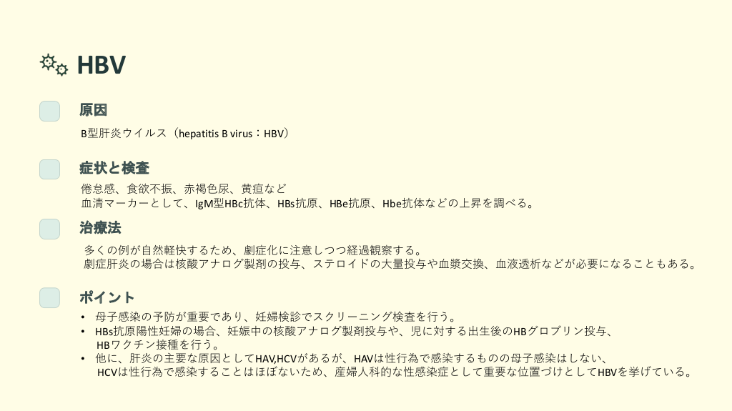 #21. HBV 原因 B型肝炎ウイルス(hepatitis B virus:HBV) 症状と検査 倦怠感、食欲不振、赤褐色尿、黄疸など 血清マーカーとして、IgM型HBc抗体、HBs抗原、HBe抗原、Hbe抗体などの上昇を調べる。 治療法 多くの例が自然軽快するため、劇症化に注意しつつ経過観察する。 劇症肝炎の場合は核酸アナログ製剤の投与、ステロイドの大量投与や血漿交換、血液透析などが必要になることもある。 ポイント • 母子感染の予防が重要であり、妊婦検診でスクリーニング検査を行う。 • HBs抗原陽性妊婦の場合、妊娠中の核酸アナログ製剤投与や、児に対する出生後のHBグロブリン投与、 HBワクチン接種を行う。 • 他に、肝炎の主要な原因としてHAV,HCVがあるが、HAVは性行為で感染するものの母子感染はしない、 HCVは性行為で感染することはほぼないため、産婦人科的な性感染症として重要な位置づけとしてHBVを挙げている。 preencoded.png