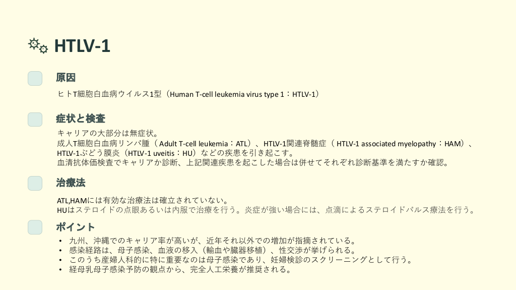 #22. HTLV-1 原因 ヒトT細胞白血病ウイルス1型(Human T-cell leukemia virus type 1:HTLV-1) 症状と検査 キャリアの大部分は無症状。 成人T細胞白血病リンパ腫( Adult T-cell leukemia:ATL)、HTLV-1関連脊髄症( HTLV-1 associated myelopathy:HAM)、 HTLV-1ぶどう膜炎(HTLV-1 uveitis:HU)などの疾患を引き起こす。 血清抗体価検査でキャリアか診断、上記関連疾患を起こした場合は併せてそれぞれ診断基準を満たすか確認。 治療法 ATL,HAMには有効な治療法は確立されていない。 HUはステロイドの点眼あるいは内服で治療を行う。炎症が強い場合には、点滴によるステロイドパルス療法を行う。 ポイント • • • • 九州、沖縄でのキャリア率が高いが、近年それ以外での増加が指摘されている。 感染経路は、母子感染、血液の移入(輸血や臓器移植)、性交渉が挙げられる。 このうち産婦人科的に特に重要なのは母子感染であり、妊婦検診のスクリーニングとして行う。 経母乳母子感染予防の観点から、完全人工栄養が推奨される。 preencoded.png