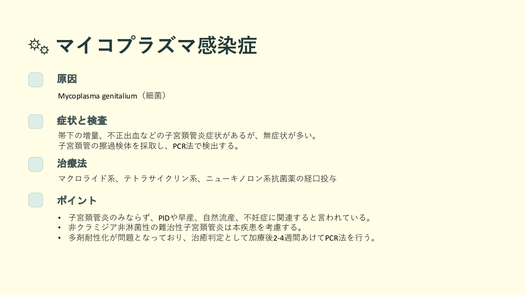 #23. マイコプラズマ感染症 原因 Mycoplasma genitalium(細菌) 症状と検査 帯下の増量、不正出血などの子宮頚管炎症状があるが、無症状が多い。 子宮頚管の擦過検体を採取し、PCR法で検出する。 治療法 マクロライド系、テトラサイクリン系、ニューキノロン系抗菌薬の経口投与 ポイント • 子宮頚管炎のみならず、PIDや早産、自然流産、不妊症に関連すると言われている。 • 非クラミジア非淋菌性の難治性子宮頚管炎は本疾患を考慮する。 • 多剤耐性化が問題となっており、治癒判定として加療後2-4週間あけてPCR法を行う。 preencoded.png