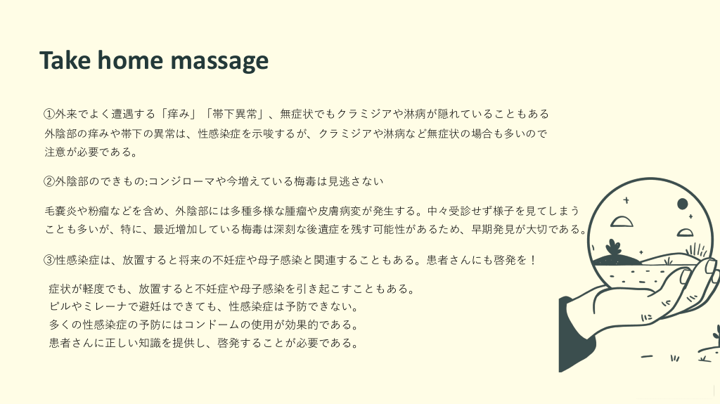 #24. Take home massage ①外来でよく遭遇する「痒み」「帯下異常」、無症状でもクラミジアや淋病が隠れていることもある 外陰部の痒みや帯下の異常は、性感染症を示唆するが、クラミジアや淋病など無症状の場合も多いので 注意が必要である。 ②外陰部のできもの:コンジローマや今増えている梅毒は見逃さない 毛嚢炎や粉瘤などを含め、外陰部には多種多様な腫瘤や皮膚病変が発生する。中々受診せず様子を見てしまう ことも多いが、特に、最近増加している梅毒は深刻な後遺症を残す可能性があるため、早期発見が大切である。 ③性感染症は、放置すると将来の不妊症や母子感染と関連することもある。患者さんにも啓発を! 症状が軽度でも、放置すると不妊症や母子感染を引き起こすこともある。 ピルやミレーナで避妊はできても、性感染症は予防できない。 多くの性感染症の予防にはコンドームの使用が効果的である。 患者さんに正しい知識を提供し、啓発することが必要である。 preencoded.png