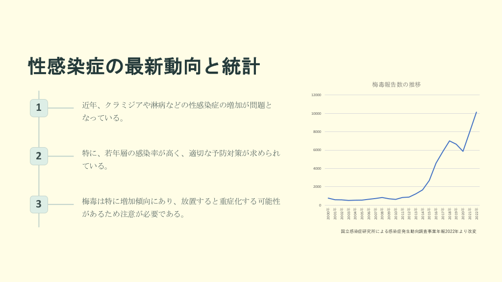 #3. 性感染症の最新動向と統計 梅毒報告数の推移 12000 1 近年、クラミジアや淋病などの性感染症の増加が問題と なっている。 10000 8000 2 特に、若年層の感染率が高く、適切な予防対策が求められ ている。 6000 4000 2000 2022年 2021年 2020年 2019年 2018年 2017年 2016年 2015年 2014年 2013年 2012年 2011年 2010年 2009年 2008年 2007年 2006年 2005年 2004年 2003年 2002年 があるため注意が必要である。 0 2001年 梅毒は特に増加傾向にあり、放置すると重症化する可能性 2000年 3 国立感染症研究所による感染症発生動向調査事業年報2022年より改変 preencoded.png