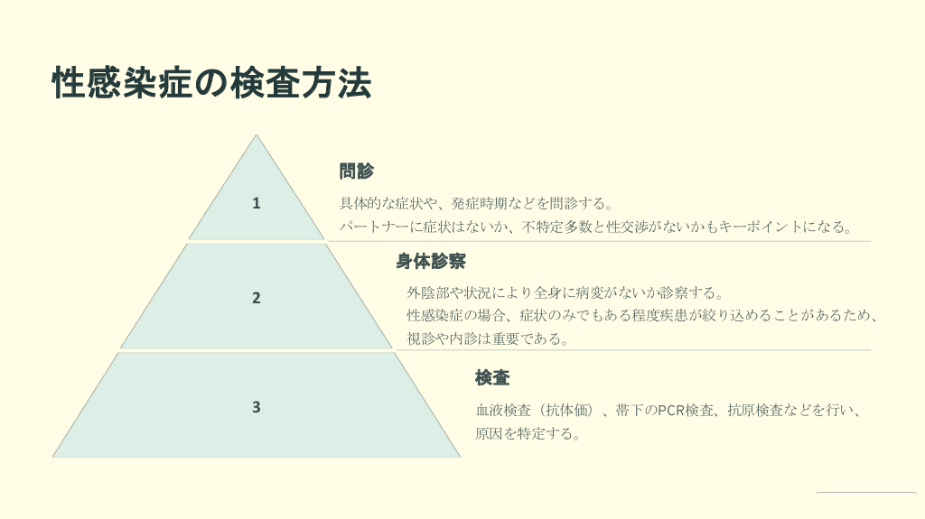#4. 性感染症の検査方法 問診 1 具体的な症状や、発症時期などを問診する。 パートナーに症状はないか、不特定多数と性交渉がないかもキーポイントになる。 身体診察 2 外陰部や状況により全身に病変がないか診察する。 性感染症の場合、症状のみでもある程度疾患が絞り込めることがあるため、 視診や内診は重要である。 検査 3 血液検査(抗体価)、帯下のPCR検査、抗原検査などを行い、 原因を特定する。 preencoded.png