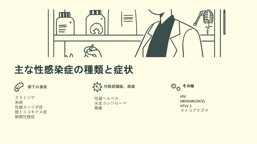 #5. 主な性感染症の種類と症状 帯下の異常 クラミジア 淋病 性器カンジダ症 腟トリコモナス症 細菌性腟症 外陰部腫瘤、潰瘍 性器ヘルペス 尖圭コンジローマ 梅毒 その他 HIV HBV(HAV/HCV) HTLV-1 マイコプラズマ preencoded.png