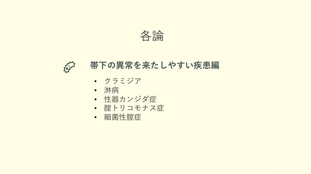 #6. 各論 帯下の異常を来たしやすい疾患編 • • • • • クラミジア 淋病 性器カンジダ症 腟トリコモナス症 細菌性腟症 preencoded.png
