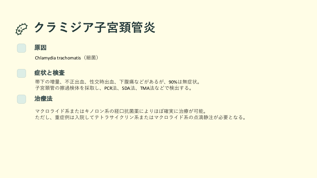 #7. クラミジア子宮頚管炎 原因 Chlamydia trachomatis(細菌) 症状と検査 帯下の増量、不正出血、性交時出血、下腹痛などがあるが、90%は無症状。 子宮頚管の擦過検体を採取し、PCR法、SDA法、TMA法などで検出する。 治療法 マクロライド系またはキノロン系の経口抗菌薬によりほぼ確実に治療が可能。 ただし、重症例は入院してテトラサイクリン系またはマクロライド系の点滴静注が必要となる。 preencoded.png