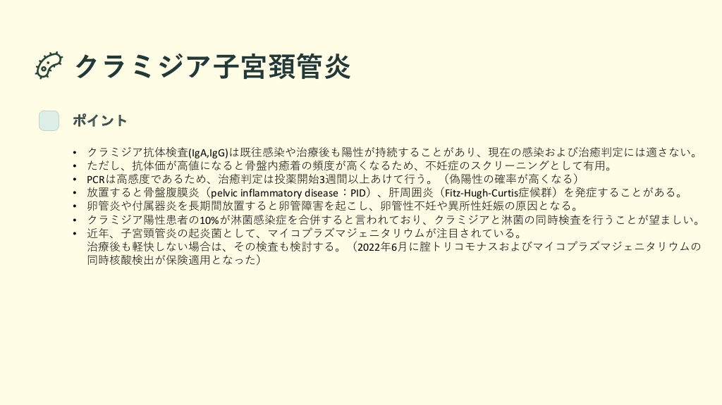 #8. クラミジア子宮頚管炎 ポイント • • • • • • • クラミジア抗体検査(IgA,IgG)は既往感染や治療後も陽性が持続することがあり、現在の感染および治癒判定には適さない。 ただし、抗体価が高値になると骨盤内癒着の頻度が高くなるため、不妊症のスクリーニングとして有用。 PCRは高感度であるため、治癒判定は投薬開始3週間以上あけて行う。(偽陽性の確率が高くなる) 放置すると骨盤腹膜炎(pelvic inflammatory disease:PID)、肝周囲炎(Fitz-Hugh-Curtis症候群)を発症することがある。 卵管炎や付属器炎を長期間放置すると卵管障害を起こし、卵管性不妊や異所性妊娠の原因となる。 クラミジア陽性患者の10%が淋菌感染症を合併すると言われており、クラミジアと淋菌の同時検査を行うことが望ましい。 近年、子宮頸管炎の起炎菌として、マイコプラズマジェニタリウムが注目されている。 治療後も軽快しない場合は、その検査も検討する。(2022年6月に腟トリコモナスおよびマイコプラズマジェニタリウムの 同時核酸検出が保険適用となった) preencoded.png