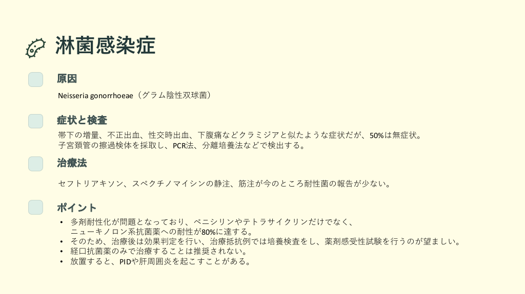 #9. 淋菌感染症 原因 Neisseria gonorrhoeae(グラム陰性双球菌) 症状と検査 帯下の増量、不正出血、性交時出血、下腹痛などクラミジアと似たような症状だが、50%は無症状。 子宮頚管の擦過検体を採取し、PCR法、分離培養法などで検出する。 治療法 セフトリアキソン、スペクチノマイシンの静注、筋注が今のところ耐性菌の報告が少ない。 ポイント • 多剤耐性化が問題となっており、ペニシリンやテトラサイクリンだけでなく、 ニューキノロン系抗菌薬への耐性が80%に達する。 • そのため、治療後は効果判定を行い、治療抵抗例では培養検査をし、薬剤感受性試験を行うのが望ましい。 • 経口抗菌薬のみで治療することは推奨されない。 • 放置すると、PIDや肝周囲炎を起こすことがある。 preencoded.png